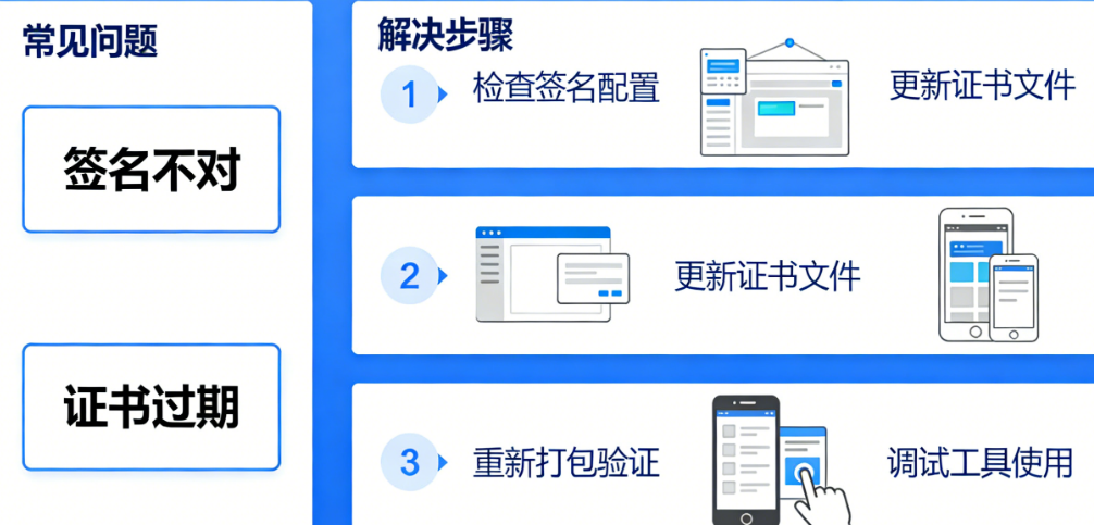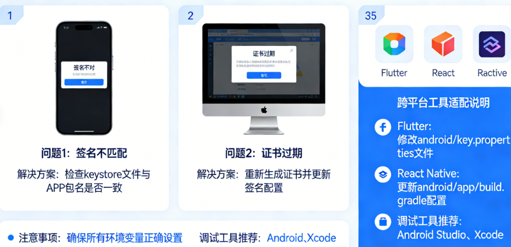 你是否有过这样的经历:辛辛苦苦开发完一个跨平台APP,准备打包发布,结果Android Studio或Xcode弹出一串红色报错——“签名验证失败”“证书已过期”“密钥库文件找不到”?又或者,你成功打出了release包,安装到手机上却发现无法覆盖旧版本,提示“签名不一致,安装失败”?更让人头疼的是,团队协作时,不同成员打包出来的APK居然不能互相覆盖安装。这些问题看似琐碎,却是每个跨平台开发者都会踩的坑。签名证书是APP的数字身份证,它决定了你的应用能否顺利发布、能否正常更新、甚至能否通过应用商店的审核。然而,证书管理恰恰是开发流程中最容易被忽视的环节。本文将系统讲解跨平台APP打包签名调试的完整知识体系,从证书原理到实战操作,从常见报错到调试技巧,帮助你彻底告别“签名不对、证书过期”的烦恼。